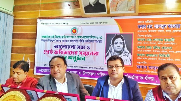 “নারী নির্যাতন বন্ধ করি,কমলা রঙের বিশ্ব গড়ি,শেখ হাসিনার বারতা,নারী পুরুষ সমতা” এই প্রতিপাদ্যকে সামনে রেখে আন্তর্জাতিক নারী নির্যাতন প্রতিরোধ পক্ষ ও বেগম রোকেয়া দিবস-২০২১ উদযাপন উপলক্ষে “জয়িতা অন্বেষনে বাংলাদেশ” শীর্ষক কার্যক্রমের আওতায় ব্রাহ্মণবাড়িয়া জেলার কসবায়  আলোচনা সভা ও শ্রেষ্ঠ জয়িতাদের সম্মাননা প্রদান অনুষ্ঠান কসবা উপজেলা সম্মেলন কক্ষে অনুষ্ঠিত হয়েছে। উপজেলা নির্বাহী অফিসার মাসুদ উল আলম এর সভাপতিত্বে অনুষ্ঠানে প্রধান অতিথি হিসেবে উপস্থিত ছিলেন কসবা উপজেলা পরিষদের চেয়ারম্যান এডভোকেট রাশেদুল কাউছার ভূইয়া জীবন,উপজেলা মহিলা বিষয়ক কর্মকর্তা রওনক ফারজানা। বিশেষ অতিথি হিসেবে উপস্থিত ছিলেন কসবা পৌর মেয়র এম জি হাক্কানী,কসবা উপজেলা পরিষদের ভাইস চেয়ারম্যান মোঃ মনির হোসেন,কসবা থানার ওসি(তদন্ত) হাবিবুর রহমান, কসবা উপজেলা কৃষি কর্মকর্তা হাজেরা বেগম, কসবা প্রেসক্লাবের সভাপতি আব্দুল হান্নান সহ বিভিন্ন প্রিন্ট ও ইলেকট্রনিকস মিডিয়ার সাংবাদিক ও অন্যান্য ব্যাক্তিবর্গ।