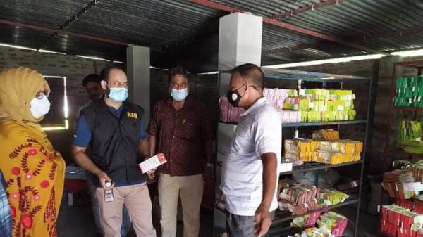 অপর দিকে একই দিন বিকেলে অবৈধ পণ্য সামগ্রী তৈরি ও বিক্রয় করার অপরাধে সায়েম ফুড এন্ড বেভারেজ এর মালিক মোঃ মিজানুর রহমান আনুমানিক বয়স (৩৫), পিতা- মাহফুজুর রহমান, সাং- বাড়াদী, কয়া, থানা-কুমারখালী, জেলা-কুষ্টিয়া’কে ১,০০,০০০/- টাকা জরিমানা পূর্বক অব্যাহতি প্রদান করেন ভ্রাম্যমাণ আদালত।