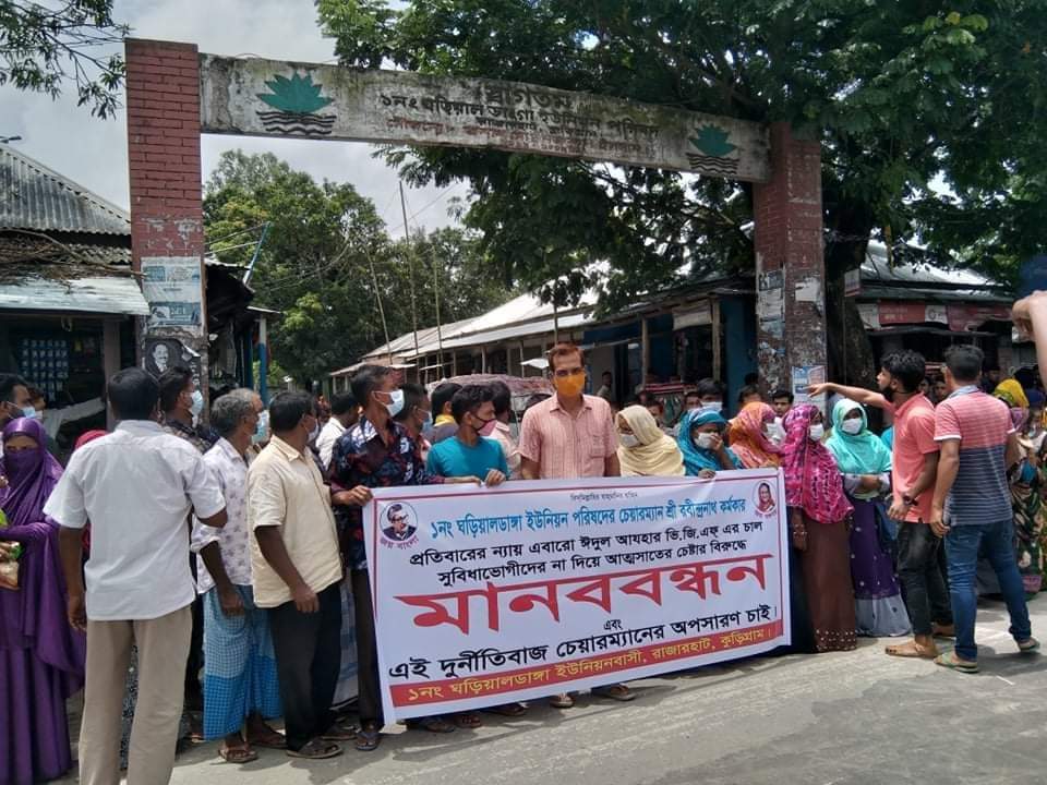 কুড়িগ্রামের রাজারহাট উপজেলার ঘড়িয়ালডাঙ্গা ইউনিয়নের চেয়ারম্যান রবীন্দ্রনাথ কর্মকারের অপসারণ এবং ইদ পূর্ব ভিজিএফসহ অন্যান্য মালামাল বিতরণের দাবীতে মানবন্ধন করা হয়েছে।