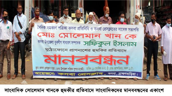 সমকালের সাংবাদিককে হত্যার হুমকির প্রতিবাদে যুবলীগ নেতা সফিকের বিরোদ্ধে কসবা প্রেসক্লাবের মানববন্ধন